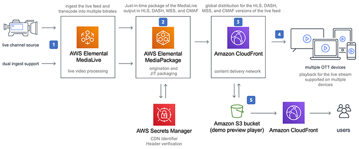 AWS的解决方案基于其全球基础设施,包括全球内容传输网络(Amazon CloudFront)、实时视频转码服务(AWS Elemental MediaLive)、视频打包和分发服务(AWS Elemental MediaPackage)等,可以帮助客户将视频内容传输到全球各地,并提供高质量和稳定性的直播体验。